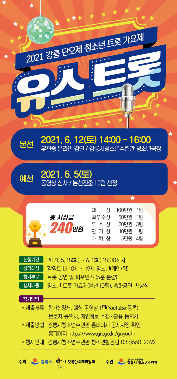 [강릉=뉴스핌] 이순철 기자 = 강원 강릉시청소년수련관은 2021 강릉 단오를 맞이해 개최하는 청소년 트롯 가요제 '유스트롯' 참가자를 모집한다고 17일 밝혔다.