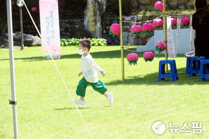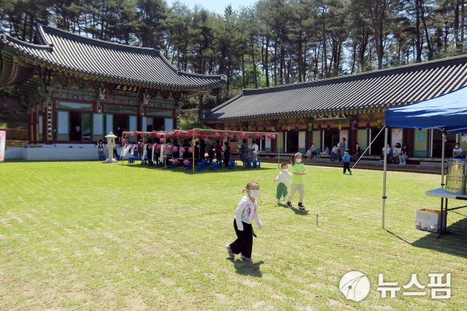 [울진=뉴스핌] 남효선 기자 = 석가탄신일인 19일 전국 사찰에서 석가 탄신을 기리는 법요식이 열리는 가운데 경북 울진의 지장사에서 불자들이 법요식을 치루고 있다. 부모를 따라 나선 어린 불자들이 지장사 무량수전 앞 마당을 천진난만하게 뛰어놀고 있다. 지장사는 법당으로 들어서는 입구에 코로나19 방역 안내소를 설치하고 법요식에 참석하는 불자와 주민들을 대상으로 꼼꼼하게 체온을 측정하고 방명록을 기록하는 등 방역수칙을 엄격하게 준수하며 진행됐다. 지장사는 조계종 말사이다.2021.05.19 nulcheon@newspim.com