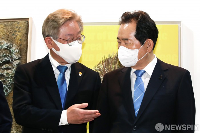[서울=뉴스핌] 정일구 기자 = 정세균 전 국무총리와 이재명 경기도지사가 19일 오후 서울 종로구 마루아트센터에서 열린 고(故) 노무현 전 대통령 서거 12주기 '사람사는 세상전(展)' 개막식에서 대화를 하고 있다. 2021.05.19 mironj19@newspim.com