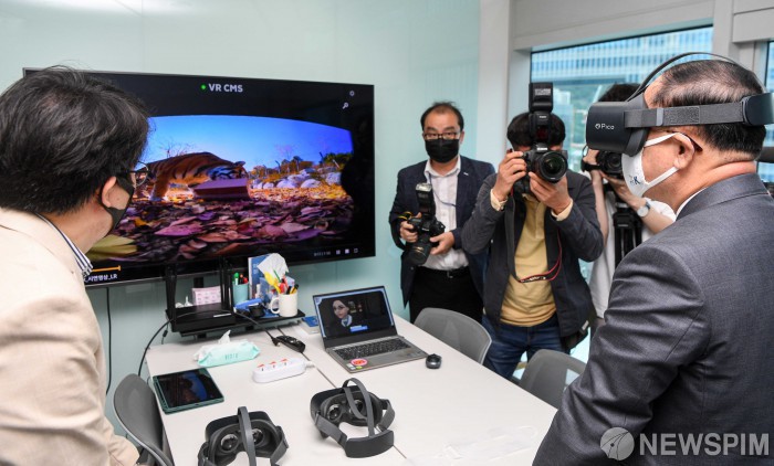 [서울=뉴스핌] 최상수 기자 = 홍남기 부총리 겸 기획재정부 장관이 20일 서울 마포구 벤타브이알을 방문해 VR 체험을 하고 있다. 2021.05.20 kilroy023@newspim.com