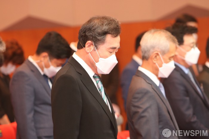 [수원=뉴스핌] 박승봉 기자 = 이낙연 전 더불어민주당 대표가 23일 오후 경기 수원시 소재 경기종합노동복지회관에서 열린 신복지경기포럼 발기인대회에 참석해 고 노무현 전 대통령 서거 12주기 추도 묵념을 하고 있다.2021.05.23 1141world@newspim.com