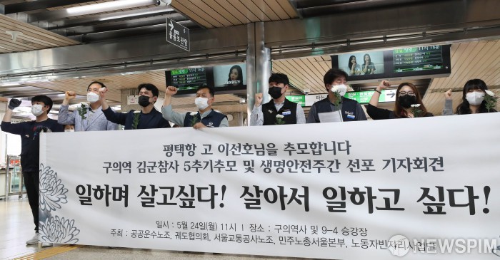 [서울=뉴스핌] 김학선 기자 = 공공운수노조 등 참석자들이 24일 서울 구의역 개찰구 앞에서 구의역 참사 5주기 추모주간 기자회견을 열고 있다. 2021.05.24 yooksa@newspim.com