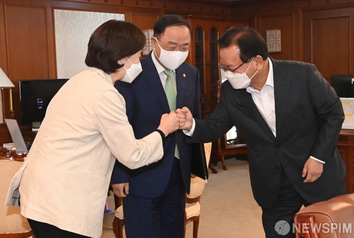 [서울=뉴스핌] 김학선 기자 = 김부겸 국무총리(오른쪽)가 25일 서울 종로구 정부서울청사에서 열린 총리-부총리 협의회에서 유은혜 사회부총리 겸 교육부 장관과 인사를 나누고 있다. 가운데는 홍남기 경제부총리 겸 기획재정부 장관. 2021.05.25 yooksa@newspim.com