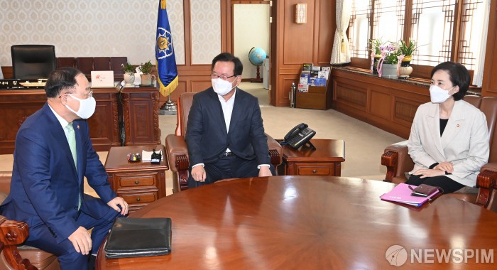 [서울=뉴스핌] 김학선 기자 = 김부겸 국무총리(가운데)가 25일 서울 종로구 정부서울청사에서 열린 총리-부총리 협의회에서 홍남기 경제부총리 겸 기획재정부 장관, 유은혜 사회부총리 겸 교육부 장관과 대화하고 있다. 2021.05.25 yooksa@newspim.com