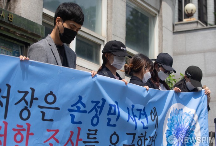 [서울=뉴스핌] 윤창빈 기자 = 반포한강사건 진실을 찾는 사람들(반진사)이 25일 오전 서울 서초구 서초경찰서 앞에서 ‘서초경찰서장은 손정민 사건에 대하여 철저한 조사를 요구한다!’ 기자회견을 열고 고인에 대한 묵념을 하고 있다. 2021.05.25 pangbin@newspim.com