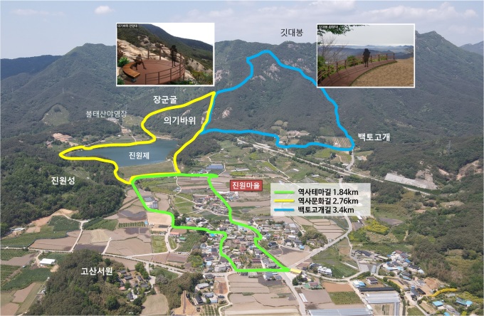 역사문화길은 진원마을의 재미있는 역사와 전설을 직접 살펴볼 수 있는 코스로 꾸며진다. 고려 초기에 축성된 진원성과 견훤의 탄생설화 무대인 장군굴, 백제 시대 슬픈 사랑 이야기가 전해 내려오고 있는 의기바위 등 볼거리가 풍성하다.