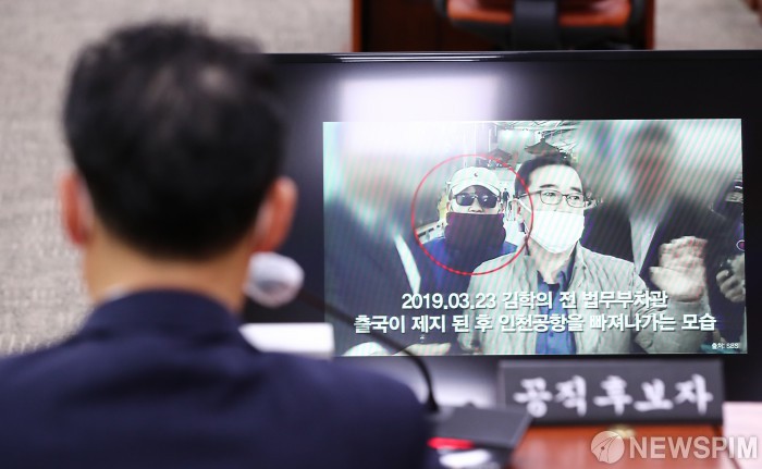 [서울=뉴스핌] 최상수 기자 = 김오수 검찰총장 후보자가 26일 국회 법제사법위원회에서 열린 인사청문회에서 더불어민주당 박성준 의원의 '김학의 전 법무부 차관 불법 출국금지'와 관련한 자료를 보고 있다. 2021.05.26 kilroy023@newspim.com
