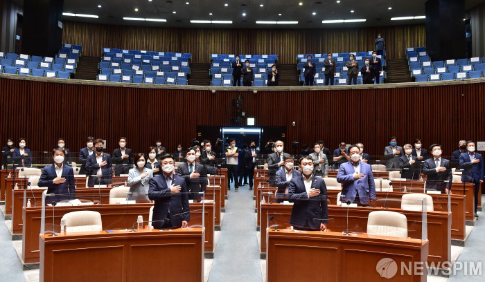 [서울=뉴스핌] 최상수 기자 = 윤호중 더불어민주당 원내대표를 비롯한 참석 의원들이 27일 국회에서 열린 부동산 관련 정책의원총회에서 국민의례를 하고 있다. 2021.05.27 kilroy023@newspim.com