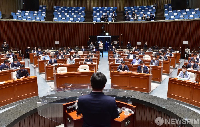 [서울=뉴스핌] 최상수 기자 = 27일 국회에서 열린 더불어민주당 부동산 관련 정책의원총회에서 참석 의원들이 윤호중 원내대표의 발언을 경청하고 있다. 2021.05.27 kilroy023@newspim.com