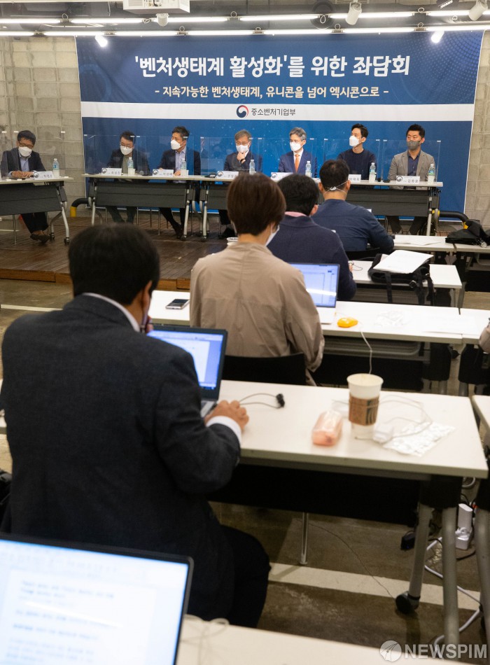 [서울=뉴스핌] 윤창빈 기자 = 권칠승 중소벤처기업부 장관이 27일 오전 서울 강남구 마루180에서 열린 ‘벤처생태계 활성화를 위한 좌담회’에서 모두발언을 하고 있다. 2021.05.27 pangbin@newspim.com