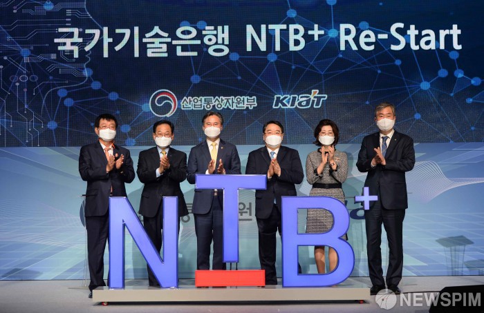 [서울=뉴스핌] 박진규 산업통상자원부 차관이 27일 오후 서울 역삼동 조선팰리스호텔 에서 열린 국가기술은행(NTB) 개편 출범식에서 참석자들과 기념촬영을 하고 있다.왼쪽부터 남인석 기술거래사회장,김영삼 전자기술연구원장,박진규 차관,석영철 산업기술진흥원장,박옥남 ㈜메디헬프라인 대표, 이낙규 생산기술연구원장. [사진=산업통상자원부 ] 2021.5.27 photo@newspim.