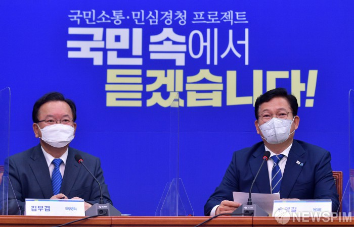 [서울=뉴스핌] 최상수 기자 = 송영길 더불어민주당 대표가 28일 국회에서 열린 고위 당정청협의회의에 참석, 모두발언을 하고 있다. 2021.05.28 kilroy023@newspim.com