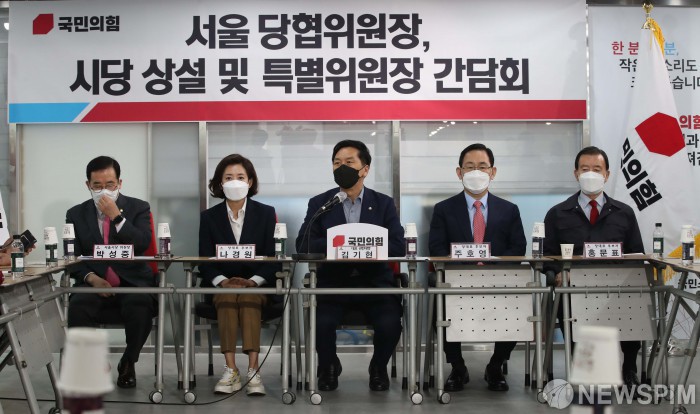 [서울=뉴스핌] 최상수 기자 = 김기현 국민의힘 당 대표 권한대행이 28일 서울 여의도 국민의힘 당사에서 열린 서울 국회의원 및 당협위원장, 시당 상설·특별위원장 간담회에서 인사말하고 있다. 2021.05.28 kilroy023@newspim.com