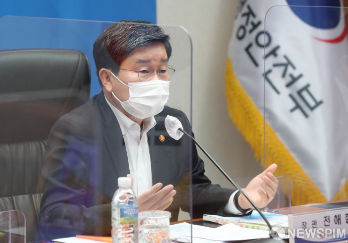 [서울=뉴스핌] 김학선 기자 = 전해철 행정안전부 장관이 28일 서울 종로구 정부서울청사에서 열린 지역사회혁신 책임관 회의를 주재하고 있다. 2021.05.28 yooksa@newspim.com