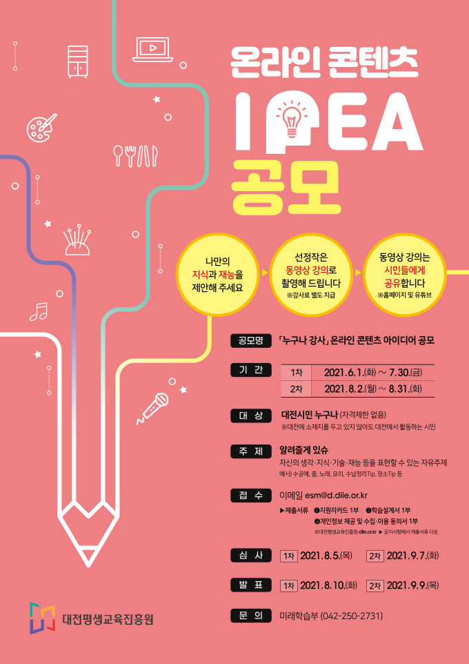 [대전=뉴스핌] 라안일 기자 = 대전평생교육진흥원은 '누구나 강사' 온라인 콘텐츠 제작을 위한 아이디어 공모를 오는 6월 1일부터 8월 31일까지 2차례에 걸쳐 진행한다.