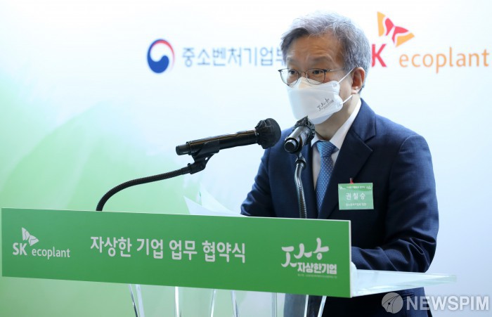 [서울=뉴스핌] 정일구 기자 = 권칠승 중소벤처기업부 장관이 3일 오후 서울 종로구 지플랜트(G.plant)에서 열린 SK에코플랜트·연구개발특구진흥재단·창조경제혁신센터협의회 '상생 오픈 플랫폼을 통한 친환경·스마트 분야 혁신기업 육성을 위한 자상한 기업 업무협약식'에서 인사말을 하고 있다. 2021.06.03 mironj19@newspim.com