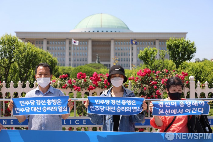 [서울=뉴스핌] 최상수 기자 = 더불어민주당 권리당원 모임 회원들이 4일 오후 국회 정문 앞에서 기자회견을 열고 당 경선 연기를 촉구하고 있다. 2021.06.04 kilroy023@newspim.com