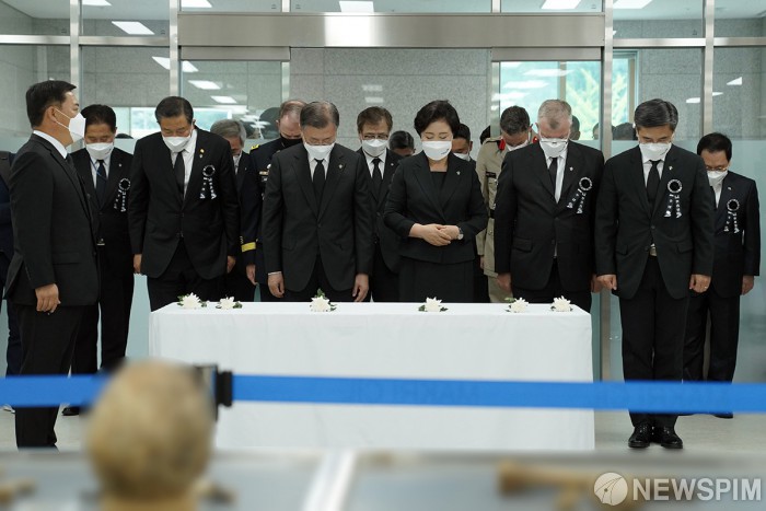 [서울=뉴스핌] 문재인 대통령과 부인 김정숙 여사가 6일 오전 서울 동작구 국립서울현충원에서 열린 제66회 현충일 추념식후 현충원내 국방부 유해발굴감식단 신원확인센터에서 묵념하고 있다.[사진=청와대 ] 2021.06.06 photo@newspim.