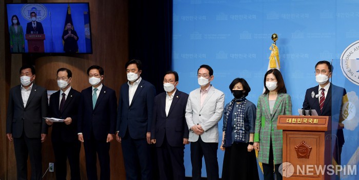 [서울=뉴스핌] 최상수 기자 = 최형두 국민의힘 의원을 비롯한 부산·울산·경남 국민의힘 의원들이 8일 오전 서울 여의도 국회 소통관에서 삼성가 컬렉션 미술관 서울·수도권 건립계획 취소 촉구 기자회견을 갖고 있다. 2021.06.08 kilroy023@newspim.com