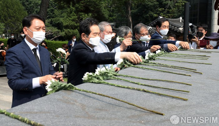 [서울=뉴스핌] 정일구 기자 = 정세균 전 국무총리와 이광재 더불어민주당 의원이 9일 오후 서울 서대문구 연세대학교 한열동산에서 열린 제34주기 이한열 추모식에서 헌화하고 있다. 2021.06.09 mironj19@newspim.com