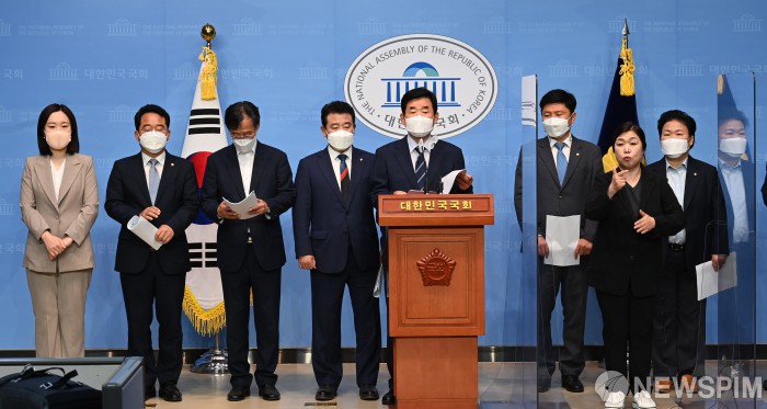 [서울=뉴스핌] 최상수 기자 = 김진표(왼쪽 다섯번째) 더불어민주당 부동산특위 위원장이 10일 오전 국회 소통관에서 주택시장 안정을 위한 추가 공급대책을 발표하고 있다. 2021.06.10 kilroy023@newspim.com