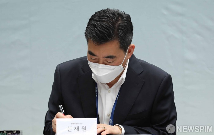 [서울=뉴스핌] 백인혁 기자 = 신재원 현대자동차 사장이 10일 오전 서울 마포구 문화비축기지에서 열린 도심항공교통(UAM) 실현을 위한 업무협약식에서 협약서에 서명을 하고 있다. 2021.06.10 dlsgur9757@newspim.com