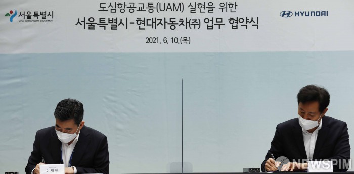 [서울=뉴스핌] 백인혁 기자 = 오세훈 서울시장(오른쪽)과 신재원 현대자동차 사장이 10일 오전 서울 마포구 문화비축기지에서 열린 도심항공교통(UAM) 실현을 위한 업무협약식에서 협약서에 서명을 하고 있다. 2021.06.10 dlsgur9757@newspim.com