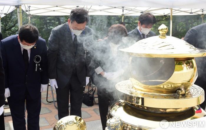 [서울=뉴스핌] 국회사진취재단 = 송영길 더불어민주당 대표가 10일 서울 동작구 국립서울현충원 묘역에서 열린 이희호 여사 2주기 추도식에서 참배를 하고 있다. 2021.06.10 photo@newspim.com