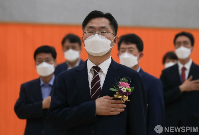 [서울=뉴스핌] 윤창빈 기자 = 이정수 신임 서울중앙지검장이 11일 오전 서울 서초구 중앙지검에서 열린 취임식에 참석해 국기에 대한 경례를 하고 있다. 2021.06.11 pangbin@newspim.com
