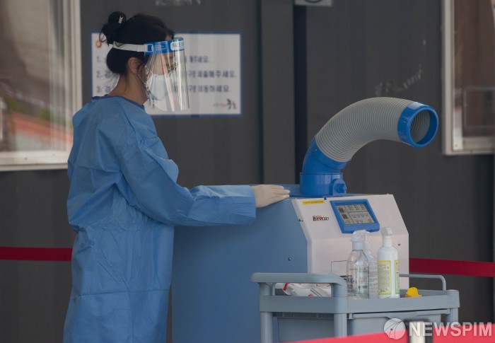 [서울=뉴스핌] 윤창빈 기자 = 12일 오전 서울 중구 서울역광장에 마련된 코로나-19 임시선별검사소에서 의료진이 냉방기기를 점검하고 있다. 오늘(12일) 0시 기준 신규 코로나19 확진자는 565명으로 이틀째 500명대를 유지하고 있다. 2021.06.12 pangbin@newspim.com