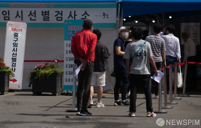 [서울=뉴스핌] 윤창빈 기자 = 12일 오전 서울 중구 서울역광장에 마련된 코로나-19 임시선별검사소에서 시민들이 검사를 받기 위해 대기하고 있다. 오늘(12일) 0시 기준 신규 코로나19 확진자는 565명으로 이틀째 500명대를 유지하고 있다. 2021.06.12 pangbin@newspim.com