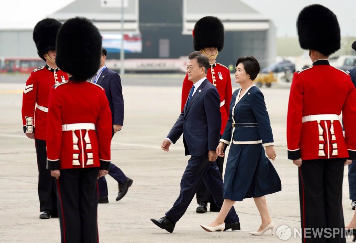 [서울=뉴스핌] 문재인 대통령과 김정숙 여사가 11일 오후(현지시간) 영국 콘월 뉴키 공항에 도착, 공군 1호기에서 내려 이동하고 있다. [사진=청와대] 2021.06.12 photo@newspim.com