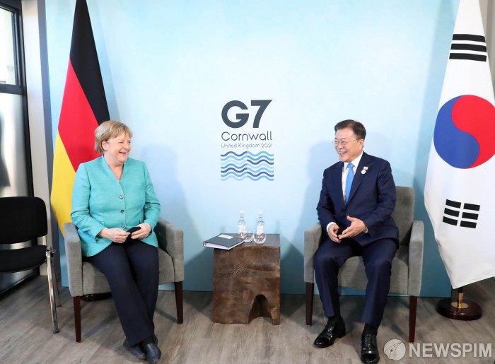 [서울=뉴스핌] 문재인 대통령이 12일(현지시간) 영국 콘월 카비스베이 양자회담장에서 열린 앙겔라 메르켈 독일 총리와의 한-독 정상회담을 하고 있다. [사진=청와대] 2021.06.12 photo@newspim.com