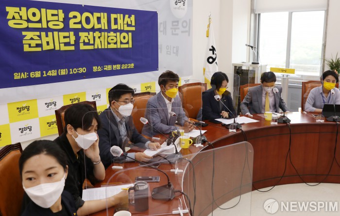 [서울=뉴스핌] 최상수 기자 = 박원석 정의당 대선준비단장 겸 전략기획소위원회 위원장(왼쪽 세 번째)이 14일 오전 서울 여의도 국회에서 열린 20대 대선 준비단 전체회의에서 발언을 하고 있다. 2021.06.14 kilroy023@newspim.com