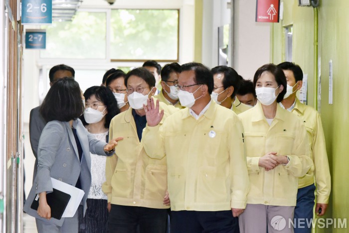 [서울=뉴스핌] 김학선 기자 = 학교 방역상황 점검에 나선 김부겸 국무총리가 14일 서울 목동 신목중학교를 방문해 학생들에게 손을 흔들며 인사하고 있다. 2021.06.14 yooksa@newspim.com