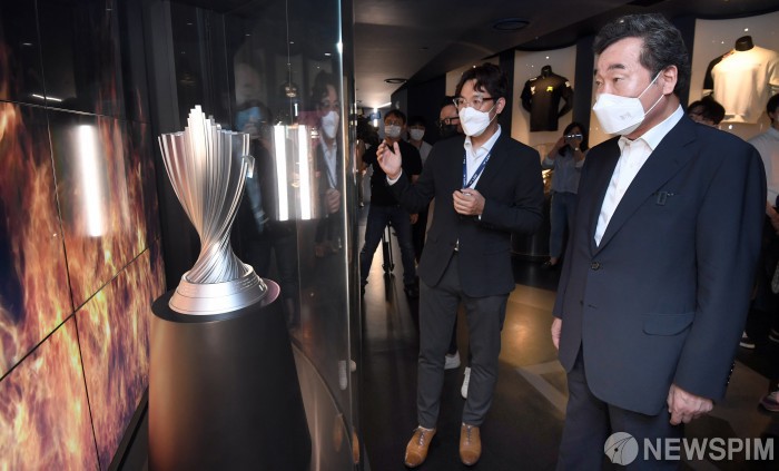 [서울=뉴스핌] 국회사진취재단 = 더불어민주당 이낙연 전 대표가 14일 서울 종로구 E스포츠 롤파크 경기장을 방문해 롤 챔피언스 코리아 우승 트로피를 살펴보고 있다. 2021.06.14 photo@newspim.com
