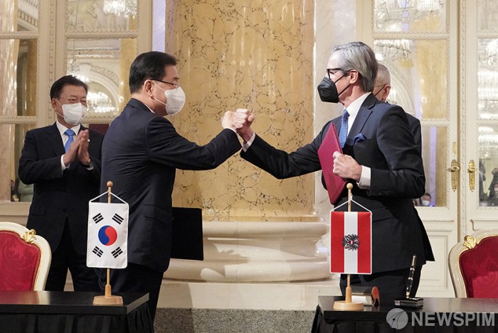 [서울=뉴스핌] 정의용 외무부 장관과 페터 라운스키 테펜탈 오스트리아 외교차관이 14일 (현지시간)비엔나 호프부르크궁에서 한국과 오스트리아 간의 문화협력협정문에 서명후 협정문을 교환하며 인사를 하고 있다.[사진=청와대] 2021.06.15 photo@newspim.com