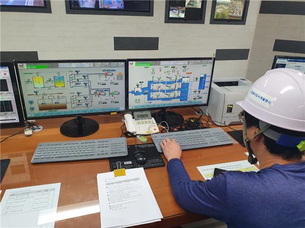 | 김해시 장유맑은물순환센터 직원이 수요 거래시장 참여를 위한 감축시험을 모니터링하고 있다.[사진=김해시] 2021.06.15 news2349@newspim.com |