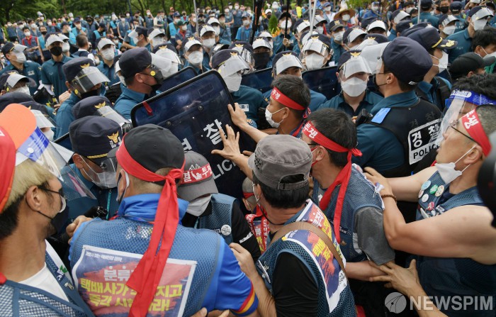 [서울=뉴스핌] 정일구 기자 = 민주노총 서비스연맹 전국택배노동조합(택배노조) 조합원들이 15일 오후 서울 영등포구 여의도공원에서 사회적합의 승리, 단협 체결 승리, 전국택배노조 결의대회에 앞서 방송 장비를 옮기던 중 경찰과 충돌하고 있다. 2021.06.15 mironj19@newspim.com