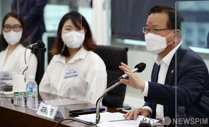 [성남=뉴스핌] 윤창빈 기자 = 김부겸 국무총리가 17일 오후 경기도 성남시 수정구 한국콘텐츠진흥원 글로벌게임허브센터에서 열린 '청년 북돋움' 청년·총리 현장대화에서 인사말을 하고 있다. 2021.06.17 pangbin@newspim.com