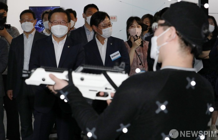 [성남=뉴스핌] 윤창빈 기자 = 김부겸 국무총리가 17일 오후 경기도 성남시 수정구 한국콘텐츠진흥원 글로벌게임허브센터를 방문해 VR(가상현실) 게임 테스트베드 현장을 둘러보고 있다. 2021.06.17 pangbin@newspim.com