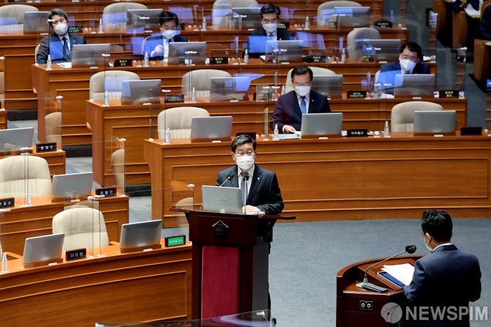 [서울=뉴스핌] 최상수 기자 = 전해철 행정안전부 장관이 22일 오후 서울 여의도 국회 본회의장에서 열린 정치·외교·통일·안보 분야 대정부질문에 출석해 최인호 더불어민주당 의원의 질의에 답변하고 있다. 2021.06.22 kilroy023@newspim.com