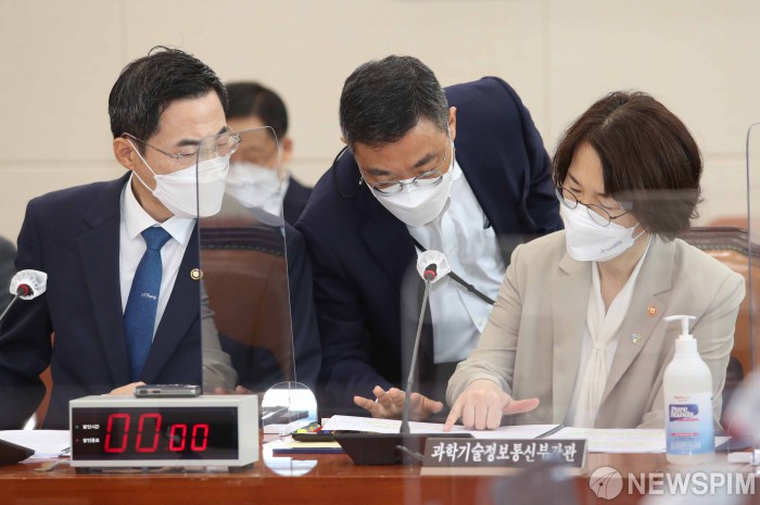 [서울=뉴스핌] 최상수 기자 = 24일 오전 서울 여의도 국회에서 열린 국회 과학기술정보방송통신위원회 전체회의에서 임혜숙 과학기술정보통신부 장관(오른쪽)과 정병선 1차관(왼쪽)이 관계자와 대화를 하고 있다. 2021.06.24 kilroy023@newspim.com