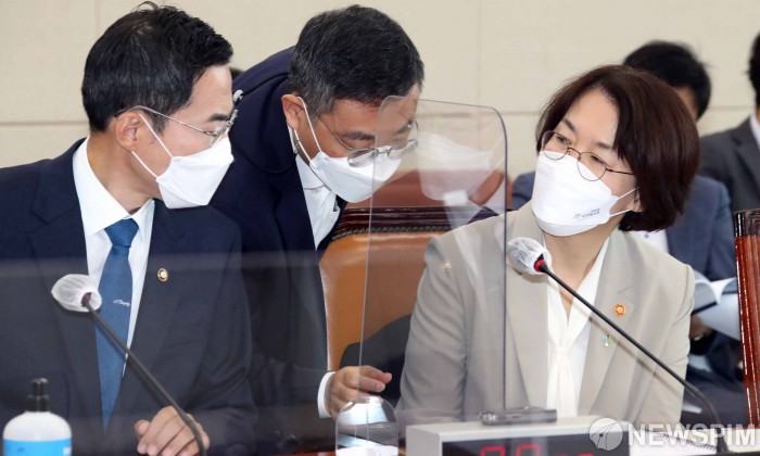 [서울=뉴스핌] 최상수 기자 = 24일 오전 서울 여의도 국회에서 열린 국회 과학기술정보방송통신위원회 전체회의에서 임혜숙 과학기술정보통신부 장관(오른쪽)과 정병선 1차관(왼쪽)이 관계자와 대화를 하고 있다. 2021.06.24 kilroy023@newspim.com
