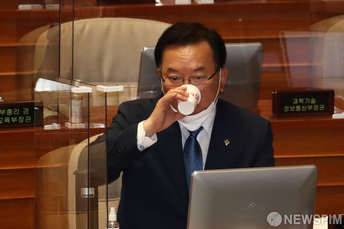 [서울=뉴스핌] 최상수 기자 = 김부겸 국무총리가 24일 국회 본회의장에서 열린 교육-사회-문화분야 대정부질문에 참석해 물을 마시고 있다. 2021.06.24 kilroy023@newspim.com