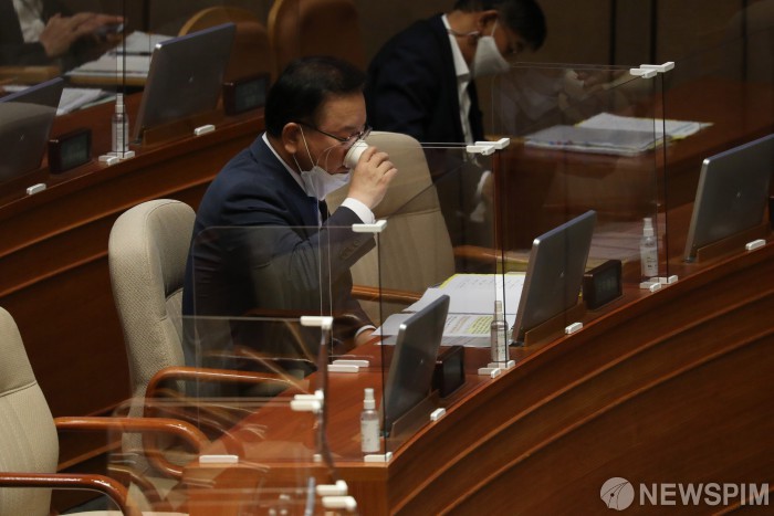 [서울=뉴스핌] 최상수 기자 = 김부겸 국무총리가 24일 서울 여의도 국회 본회의장에서 열린 교육·사회·문화분야 대정부질문에서 의원 질문에 답변을 마친 뒤 물을 마시고 있다. 2021.06.24 kilroy023@newspim.com