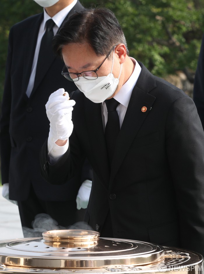 [서울=뉴스핌] 정일구 기자 = 박범계 법무부 장관이 25일 오전 서울 동작구 국립서울현충원을 찾아 현충탑에 분향하고 있다. 2021.06.25 mironj19@newspim.com