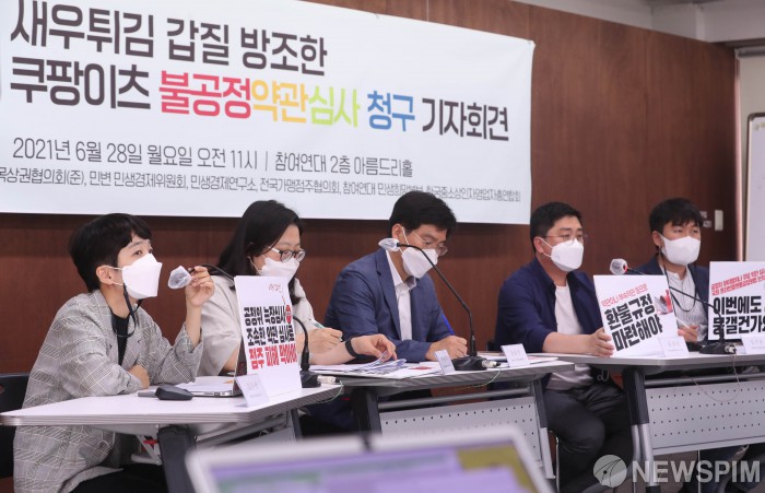 [서울=뉴스핌] 김학선 기자 = 참여연대 민생희망본부, 민변 민생경제위원회, 전국가맹점주협의회 등이 28일 서울 종로구 참여연대 아름드리홀에서 새우튀김 갑질 방조한 쿠팡이츠 불공정약관심사 청구 기자회견을 하고 있다. 2021.06.28 yooksa@newspim.com