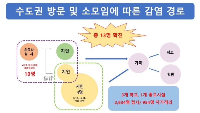 이후 지인의 가족인 초등학생과 고교생 등도 확진됐고 남구 소재 초등학교 2곳(각각 확진자 1명 발생)과 고등학교 1곳(학생 3명·교직원 2명 확진), 종교시설 1곳 등 전수검사가 이어졌다.