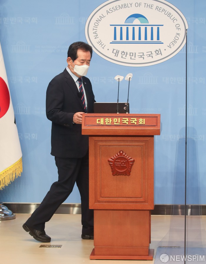 [서울=뉴스핌] 최상수 기자 = 정세균 전 국무총리가 30일 오전 서울 여의도 국회 소통관에서 열린 5대도시 철도 지하화 사업 공약 발표 기자회견에 참석하고 있다. 2021.06.30 kilroy023@newspim.com